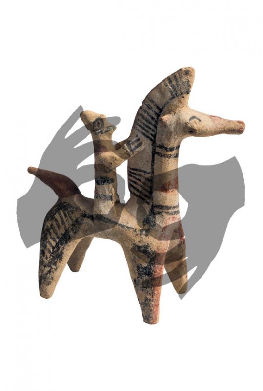 This terracotta equestrian figurine, with black and red painted decoration on an ochre-brown slip, is an outstanding example of Bichrome Ware. Specific elements, such as the schematic features of the horse and the rider with the conical cap, point to its provenance from a workshop at Idalion or Salamis. Terracotta figurines of horsemen first appeared as offerings in Cypriot sanctuaries around the end of the Late Cypriot period. They were rare in the Cypro-Geometric period, but became common both as votive offerings in sanctuaries of male deities and as grave goods during the 8th c. BC. In the Cypro-Archaic period, they were among the most popular products of coroplastic art across the island. The appearance of the subject of horse and rider in Cypriot coroplastic art and vase-painting coincides with its appearance in the Near East (Assyria) and the Aegean. Near Eastern influences must have been transmitted to Cyprus during the period of Assyrian domination of the island in the late 8th-early 7th c. BC, or possibly earlier, via the Phoenicians who were living there from the 9th c. BC. It may have been a symbol of aristocratic status, since by that time the ownership and use of a horse –not only in warfare but also in daily life or in ceremonies– was a privilege of the social elite.