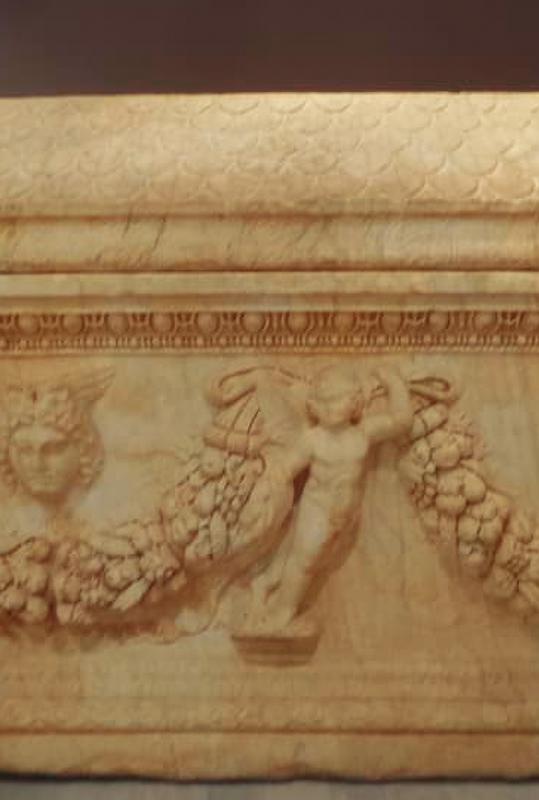 You shall now turn back and then left to cross the following rooms until you reach the gallery with the Minoan frescoes. Follow the stairs located on your left. Once you are back on the ground floor, turn right to enter the first of the two rooms that house the collection of sculptures. Pass through the first gallery and once you enter the second one, you will see on your right a Roman sarcophagus made of marble.