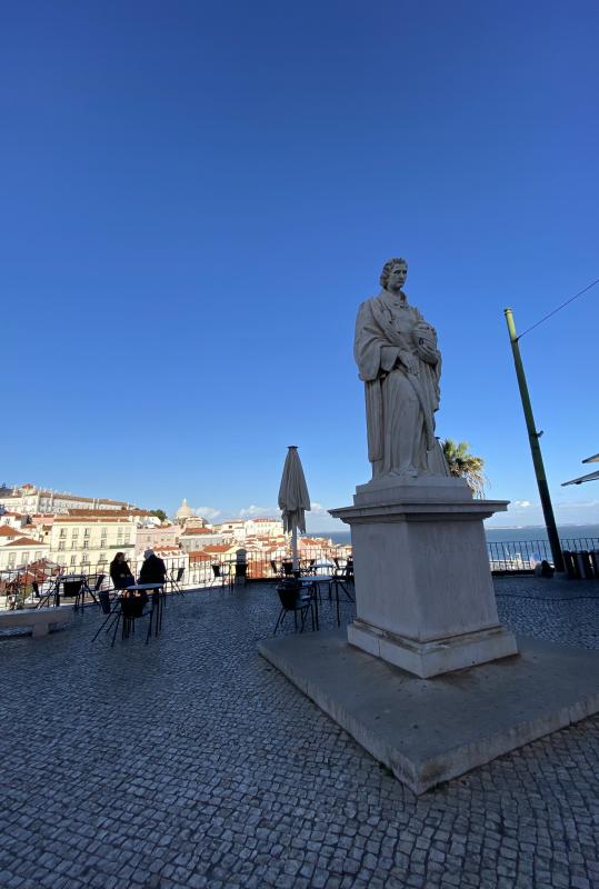 You shall now walk back to the entrance of the park, continue past the white fence and turn left to follow the cobbled street that will lead you back to the castle’s arch. Walk past the arch and keep walking until you pass the bus stop on your left. You will see a white building with a red door. Upon entering it, you will walk all the way to the park, which is visible on your left. Once you have exited and walked through the arch, you will turn left and continue walking along the yellow wall on your right. Turn right when you see the Stop sign and keep walking until you reach the viewpoint of Largo Portas do Sol. Marvel at the view over the Tagus river and the Alfama neighbourhood while listening to the following stories.