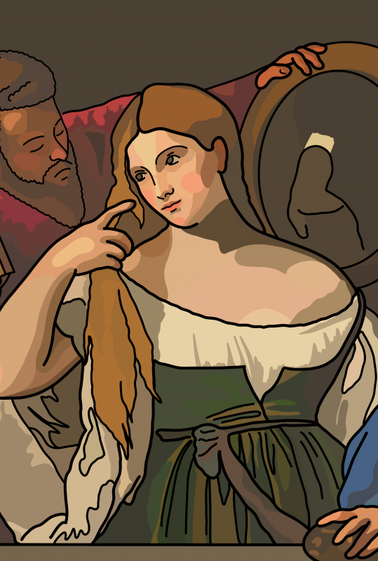 From Mona Lisa, walk to the right towards the exit. When you pass the Leonardo painting in the centre of the room, look right at the wall before reaching the corner at the painting by Titian.