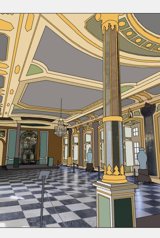 Continue straight ahead to the only door. You are now in the Hall of the Ambassadors! This time, we’re going to focus on the four magnificent thrones, the intricate paintings on the ceiling, and the charming little Chinese vases situated above the windows.