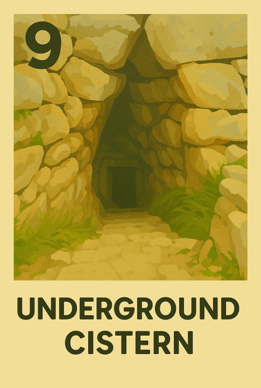 It dates to the late 13th century B.C.E., when the final phase of Mycenae's fortification was carried out to incorporate it. The underground cistern was built within the walls of the Mycenaean acropolis to provide water to the inhabitants when they were under siege. The water primarily came from a vital source, the Perseia Spring, which has been flowing since prehistoric times and still supplies water to the modern village. The descent into the underground cistern begins with the shape of the high-vaulted chamber leading to an entrance with lintels and a tympanum, characteristic examples of Mycenaean architecture. To reach it, one descends a staircase consisting of 3 levels