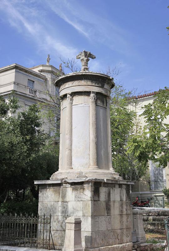 Το μνημείο του Λυσικράτη βρίσκεται στην Οδό Τριπόδων, μια αρχαία διαδρομή που συνέδεε το Θέατρο του Διονύσου με την Αθηναϊκή Αγορά. Εκατέρωθεν βρίσκονταν πολλά χορηγικά μνημεία. Είχαν ανεγερθεί για να επιδεικνύουν τους χάλκινους τρίποδες που απονέμονταν στον χορηγό των θεατρικών έργων που κέρδιζαν το πρώτο βραβείο στον ετήσιο διαγωνισμό. Ο Λυσικράτης κέρδισε το 334 π.Χ. και έχτισε αυτό το μνημείο για να τιμήσει τον Διόνυσο, τον θεό του θεάτρου, για τη νίκη του. Ήθελε επίσης να υπενθυμίσει στους συμπολίτες του τη γενναιοδωρία του η οποία του επέτρεπε να χρηματοδοτεί τη δημόσια ψυχαγωγία. Ο αρχιτέκτονας είναι άγνωστος. Το κάτω μέρος του μνημείου είναι τετράγωνο και κατασκευασμένο από λευκούς ασβεστολιθικούς όγκους. Το κυλινδρικό σκέλος είναι φτιαγμένο από εκλεκτό και ακριβό πεντελικό μάρμαρο. Είναι κοίλο και έχει διάμετρο περίπου τρία μέτρα. Οι έξι κορινθιακοί κίονες αποτελούν την πρώτη εξωτερική χρήση του συγκεκριμένου αρχιτεκτονικού ρυθμού.