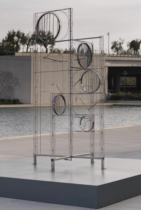 The proposal included a sculptural composition of a circle enclosing a smaller hexagon, which enclosed a pentagon with water jets forming a diagonal arc. The water sculpture was springing towards a liquid wall and a liquid 18m column. The composition also included the stainless steel sculpture Poseidon. The project was inaugurated in 1960, but Poseidon was never installed there.
